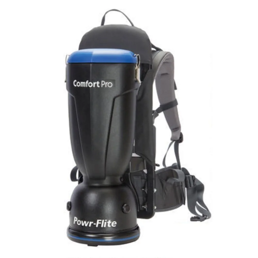 Powr‑Flite’s Comfort Pro BP10 focuses on quiet operation and operator comfort. The Spruce notes that it operates at a very low 62 dB, uses a 5‑stage filtration system, and has a 110‑inch water lift. The vacuum weighs around 12 lb and includes an adjustable, padded harness. It’s certified by the Carpet and Rug Institute (CRI) and comes with a 50‑ft cord.